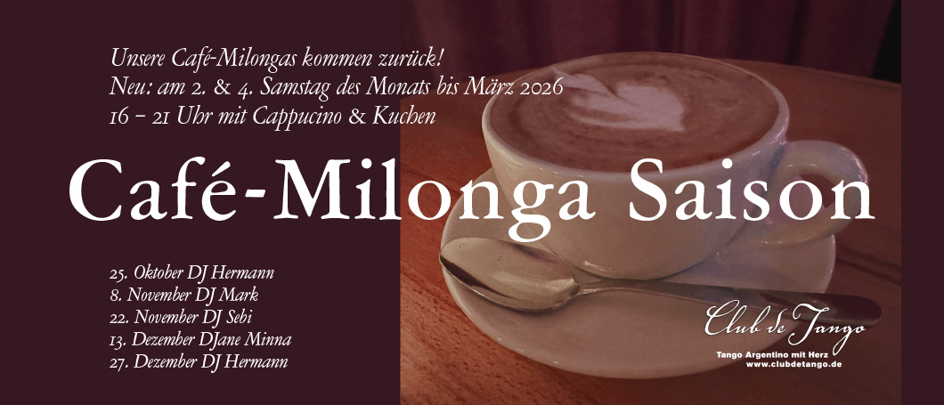 viele werden sich freuen: Ab Ende Oktober wollen wir’s wissen und machen jede unserer Milongas zur Café-Milonga! An jedem 2. & 4. Samstag im Monat könnt ihr Café, Cuchen & Canaro zur Nachmittagszeit von 16 – 21 Uhr genießen.
